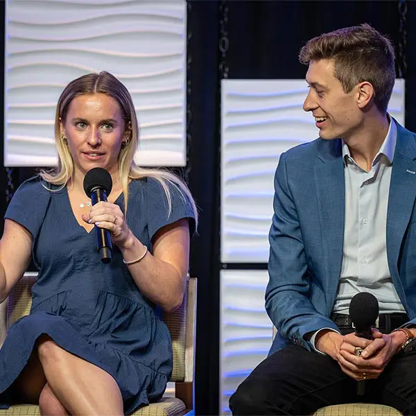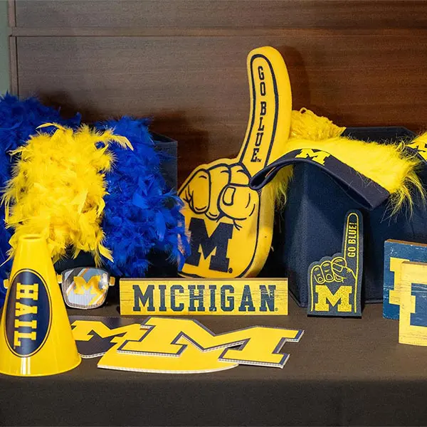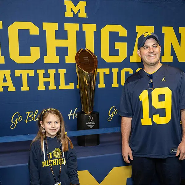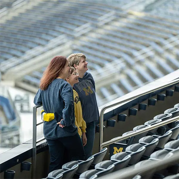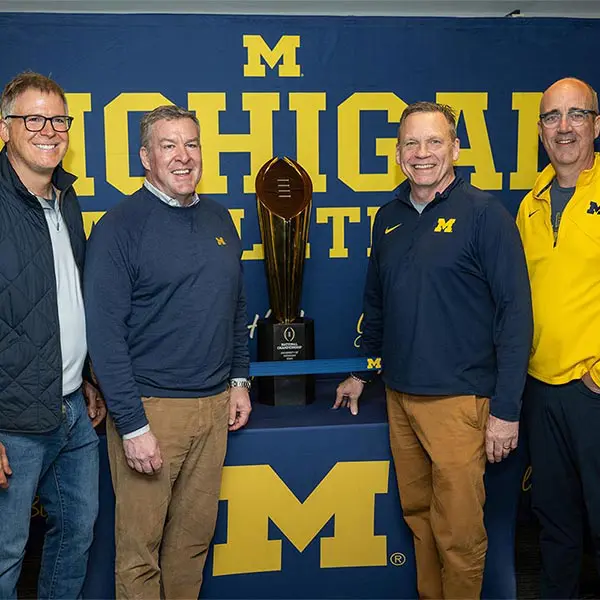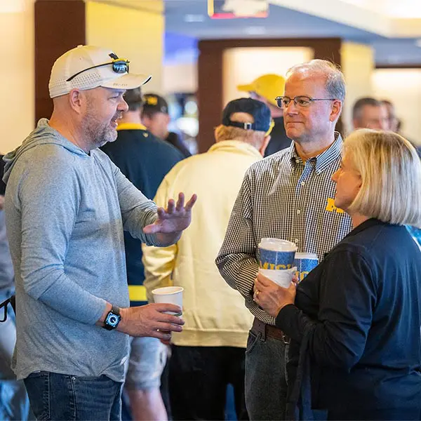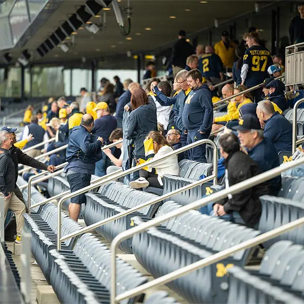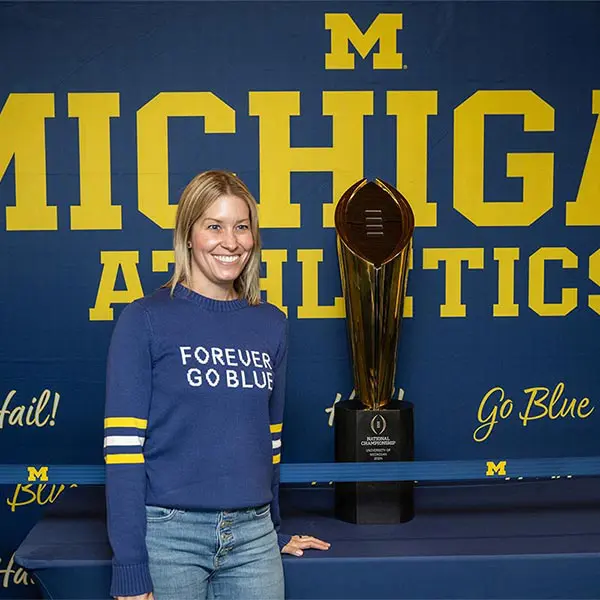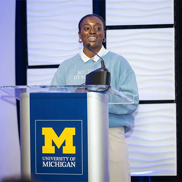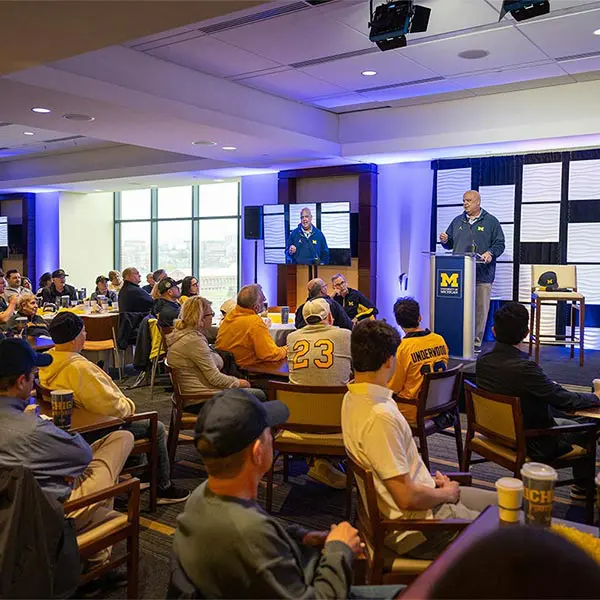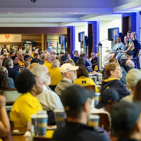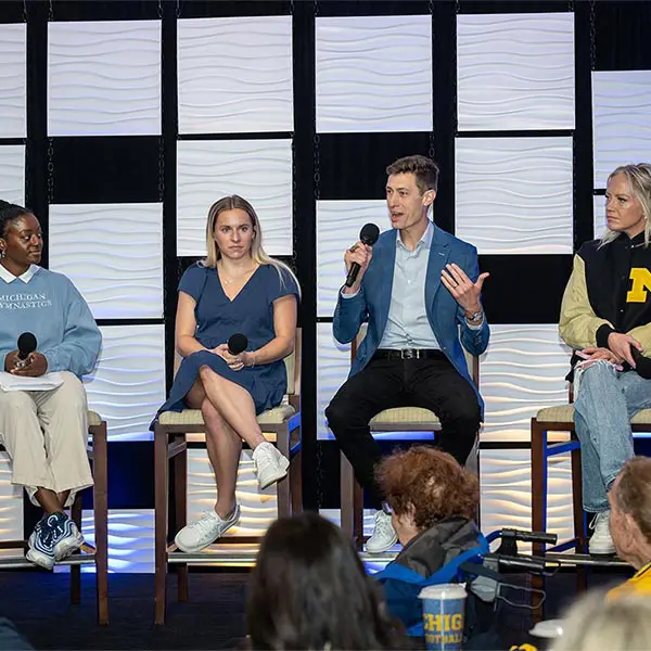 Prior to the football Spring Game, Michigan Athletics hosted over 900 donors in the Jack Roth Stadium Club as a way to express our gratitude for their support. Women's gymnastics alumna Gabby Wilson, herself a national champion, hosted a panel of fellow national champions: Abby Heiskell (2021 women's gymnastics team), Mason Ferlic (2016 3,000m steeplechase) and Tiffany Worthy (2005 softball team).